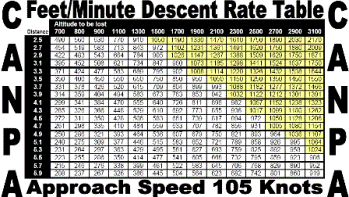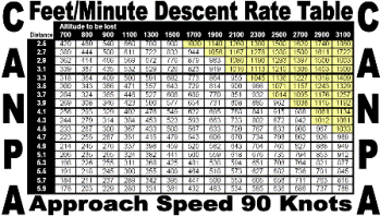At 90 knots, your required descent rate would be 326 Feet/Minute multiplied by 1.5 to give you a descent rate of 489 Feet/Minute required to maintain a stabilized approach. That’s something you can see that on the VSI. This calculation, however, could add unnecessary busywork while you're trying to conduct an approach. As such, I've created downloadable CANPA descent rate tables for 90 and 105 knot approach speeds. This two approach speeds cover about 90% of the general aviation aircraft out there. If it doesn't cover your aircraft, at least you can use the formula described above to determine the appropriate numbers for your aircraft.