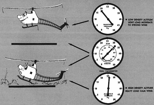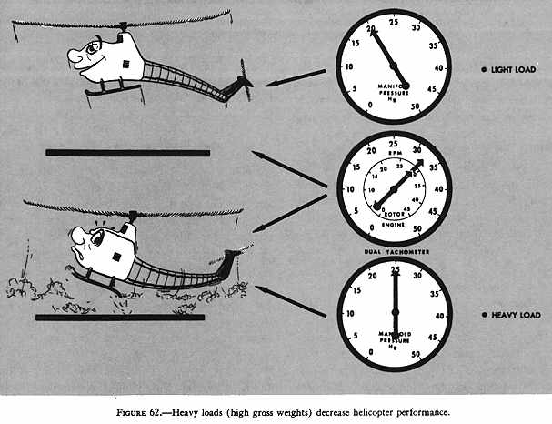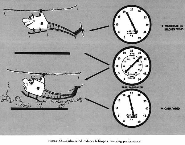 hour. Translational lift is created by airspeed, not groundspeed. Therefore, translational lift is also present when the helicopter is hovering in a wind. If the wind velocity is 15 miles per hour or more, the helicopter will be experiencing effective translational lift in a hover. Due to this increased lift, less power will be required to hover than would be required for hovering in a no-wind condition (see figure 63 to the right); or, a greater gross weight could be carried when takeoff is to be made in a wind exceeding 15 miles per hour than could be carried if takeoff is to be made in a no-wind condition. No-wind conditions increase the amount of power necessary to hover, or require that a lighter load be carried. Thus, no-wind conditions reduce helicopter performance. Since wind decreases the power required for hovering, or permits taking off or landing with greater loads, helicopter performance is improved. If the wind exceeds 15 miles per hour, performance is improved considerably; however, wind gusts over 30 to 35 miles per hour may tend to destroy the additional lift obtained between 15 and 30 miles per hour. PRACTICAL METHODS FOR PREDICTING HELICOPTER PERFORMANCE Certain practical methods for predicting helicopter performance were developed through engineering and flight tests for a particular model helicopter used by the Army. These practical methods for this particular helicopter are given in this handbook to give the reader a clearer understanding of factors influencing helicopter performance, and sound principles on which to base flight decisions. We wish to emphasize the fact that these rules are for a particular helicopter used by the Army and the actual figures will apply only to this particular helicopter. Even though such practical aids are developed for a helicopter, they should not be used as substitutes for experience and good judgment. Manifold pressure and payload Tests on this particular helicopter showed that 1 inch of manifold pressure was equivalent to 6 horsepower (HP), and that 1 HP would lift 13.5 pounds of weight while hovering. When combined, these two facts give rise to this practical rule: Rule No. 1 - One inch of manifold pressure will lift 80 pounds of payload. With this knowledge, the pilot can obtain an estimate of the additional weight that can safely be carried to hover and then to enter flight. This rule may be applied before landing at destination in this manner: